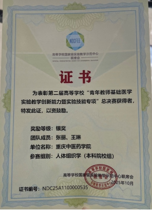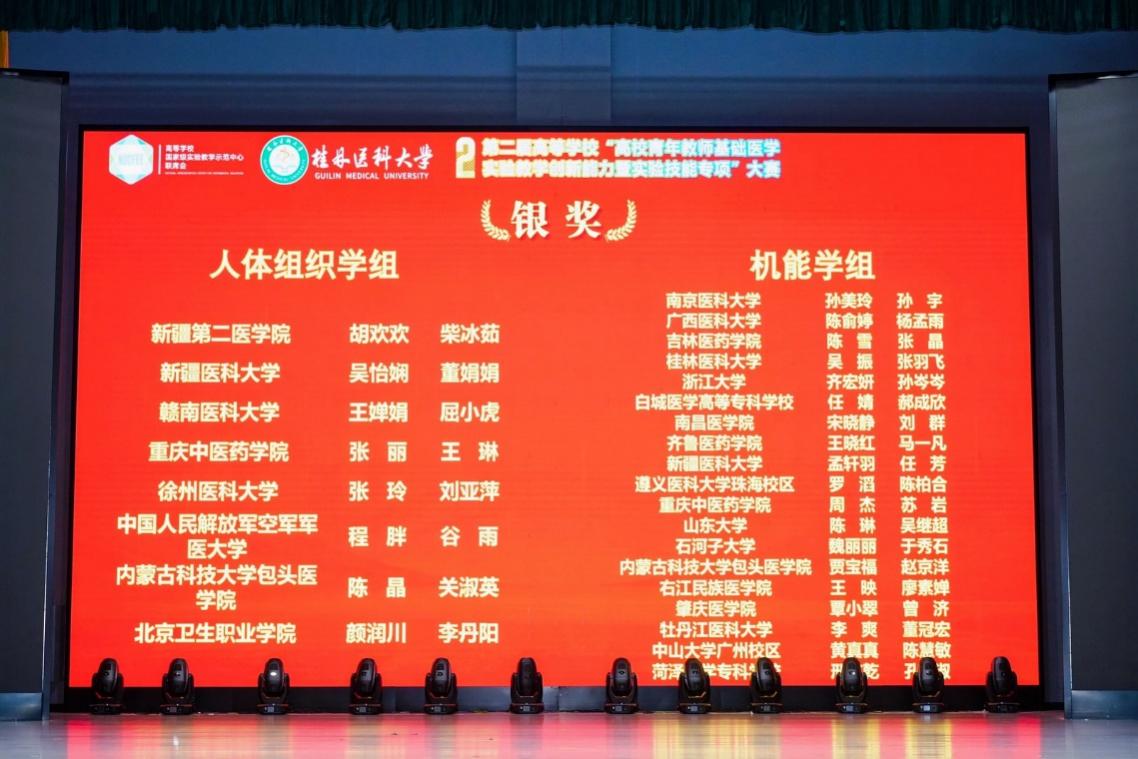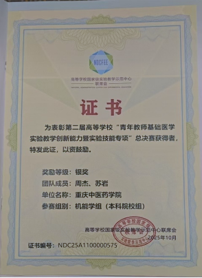近日,第二届高等学校“高校青年教师基础医学实验教学创新能力暨实验技能专项”大赛在桂林医科大学举行。我院基础医学院教师周杰、苏岩在该项比赛中荣获“机能学组(本科院校组)”银奖,张丽、王琳荣获“人体组织学组(本科院校组)”银奖,充分展现了学院基础医学教育教学的显著成效。