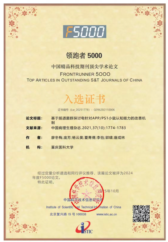 近日,国家科技部中国科学技术信息研究所(以下称“中信所”)发布2025年度“领跑者5000——中国精品科技期刊顶尖学术论文(F5000)”入选论文名单。我院针灸推拿学院院长唐成林教授参与指导的论文《基于肠道菌群探讨电针对APP/PS1小鼠认知能力的改善机制》成功入选。