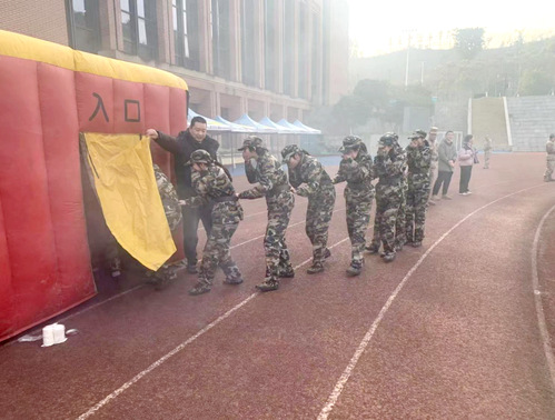 理论授课结束后,全体参训学生分批次进行了烟雾逃生舱实景模拟演练。通过高度仿真的浓烟、黑暗与高温环境体验,有效锻炼了学生在复杂紧急状况下的心理调适能力、判断决策能力及有序疏散能力,实现了消防安全理论教学与实战技能训练的有效结合。