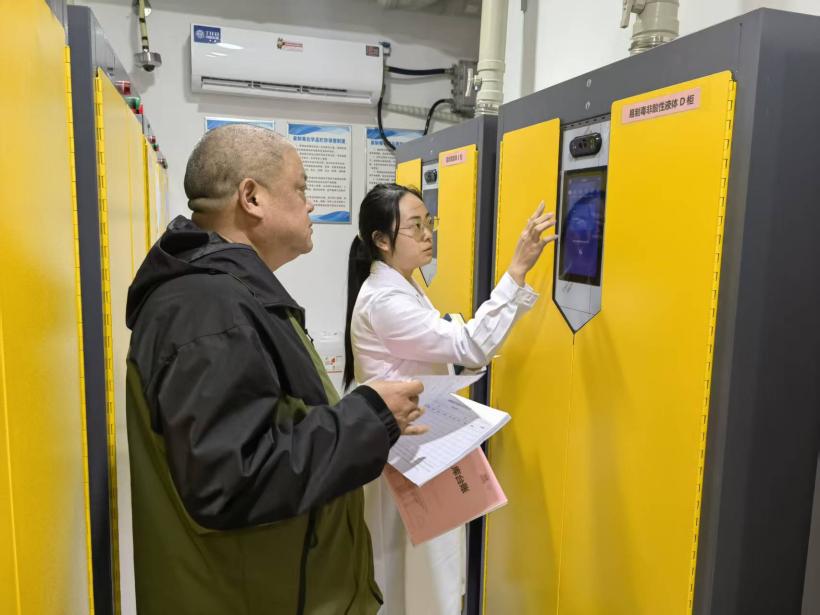检查过程中,伍从华一行实地查看了危化品暂存间的储存条件、安防设施及相关管理制度的落实情况,并现场随机抽检了部分现存危化品,重点核对了台账记录、使用登记及库存数据等。