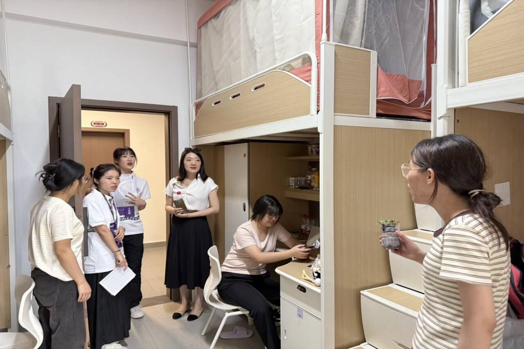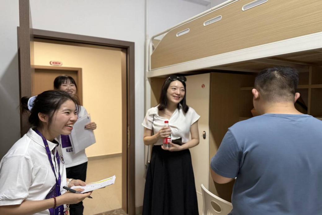 迎新日临近尾声,党总支副书记、副院长(主持工作)刘薇薇,辅导员刘怡及班主任段擎云一行深入学生宿舍,走访慰问新生。“家乡是哪里?”“对校园环境还适应吗?”刘薇薇副院长与新生们亲切交谈,细致了解他们的入住感受与需求,耐心倾听困惑,并真诚征求大家对迎新工作的意见。志愿者们也协助新生办理入住,耐心解答疑问。