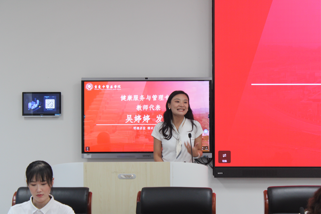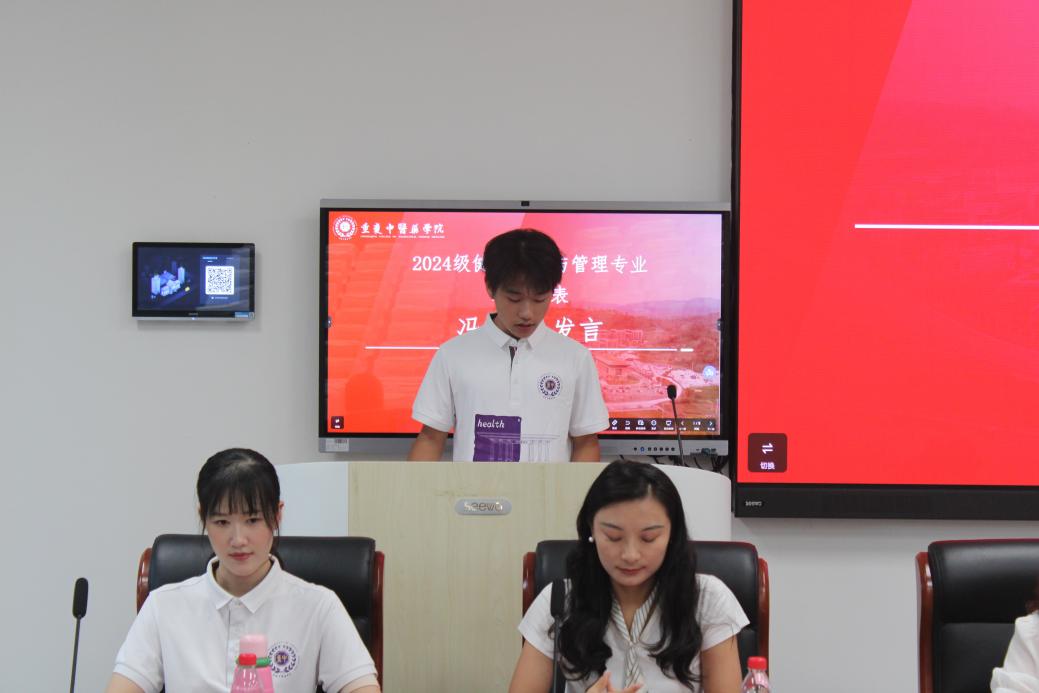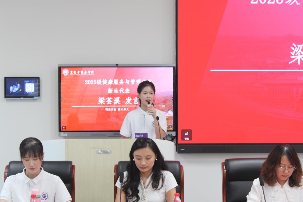首先是2025级健康服务与管理专业的新生代表梁芸溪发言,她分享了选择健康服务与管理专业的初心与憧憬。她表示,当了解到专业紧密契合“银发经济”与全民健康的国家战略时,内心深受触动,这让她坚信:“我们在这里学习的,不仅是知识技能,更是把握时代脉搏、回应社会需求的宝贵能力。”