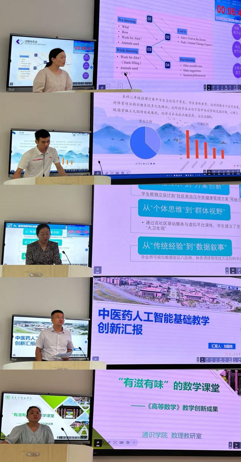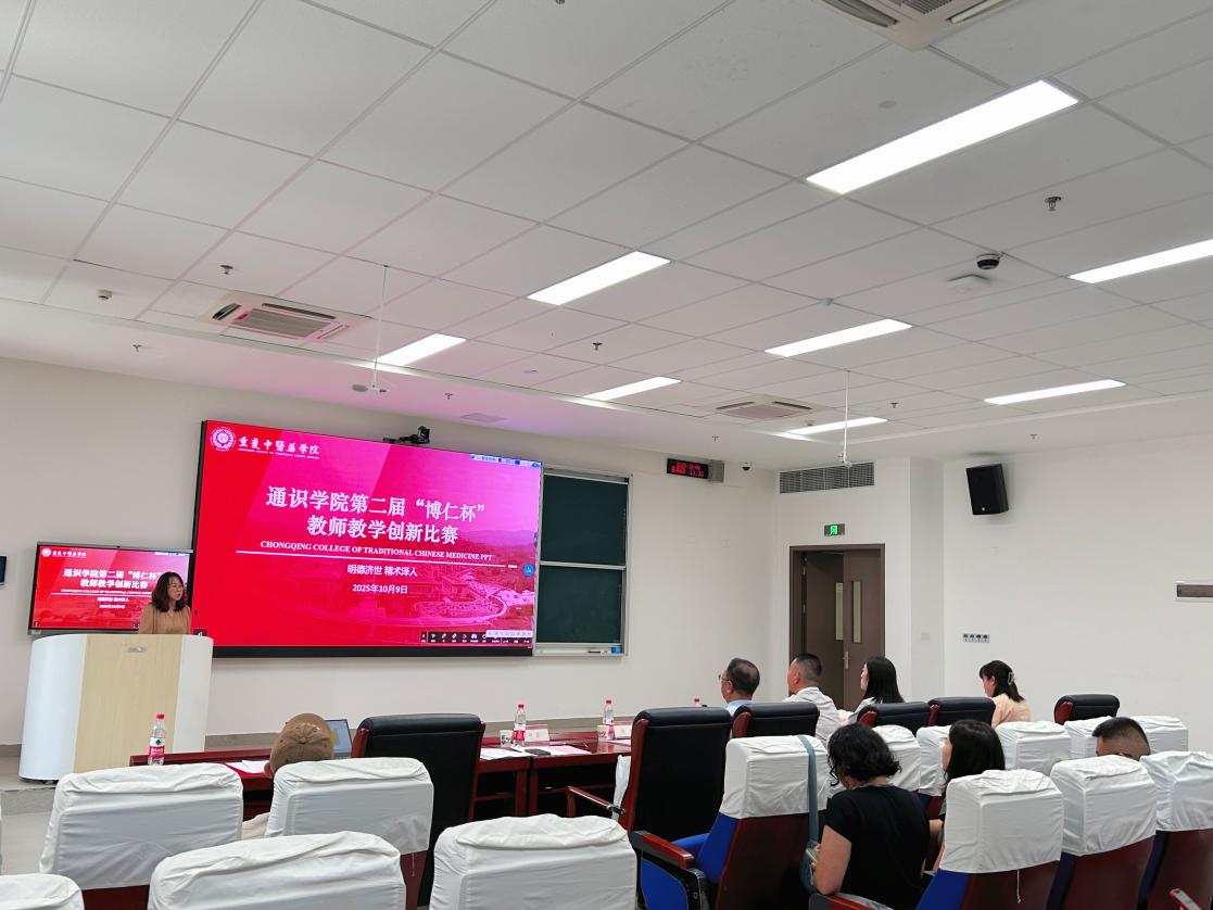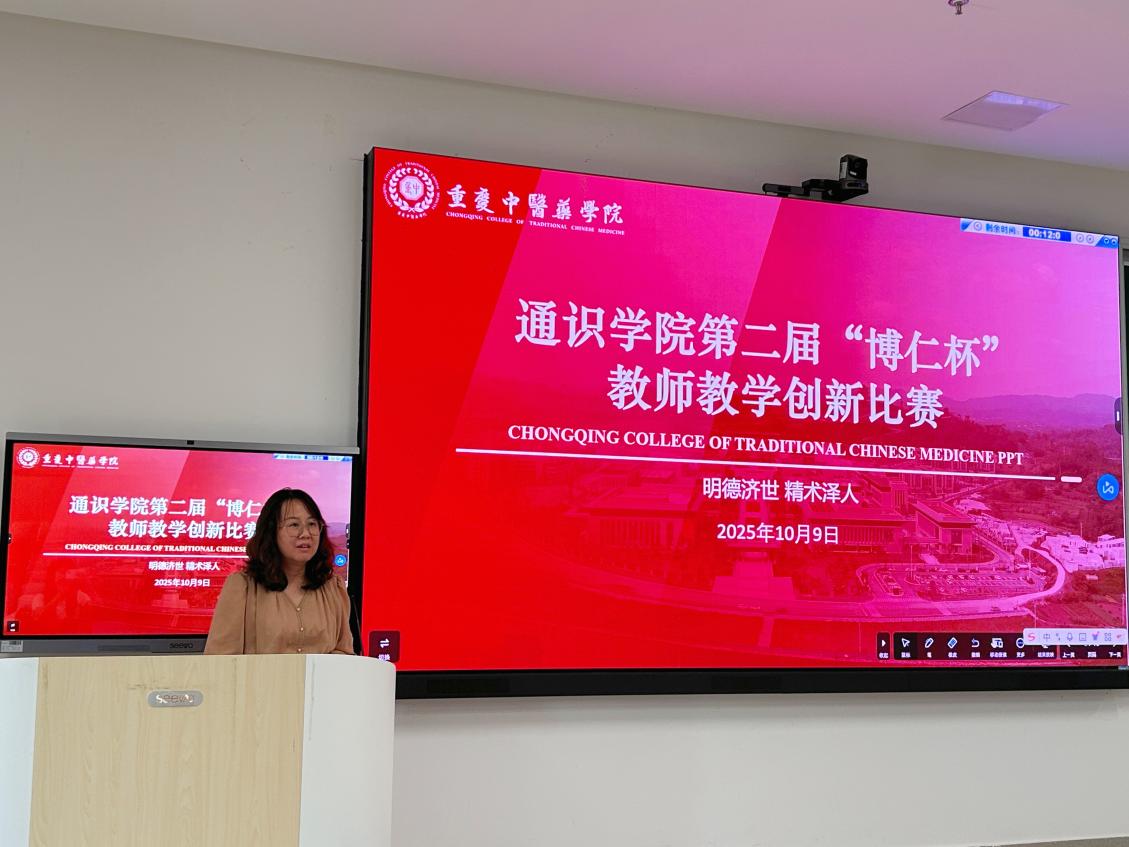 为落实立德树人根本任务,助力高校新文科、新工科、新农科、新医科“四新”建设,通识学院于2025年10月9日在E1-104会议室举办了通识学院第二届“博仁杯”教师教学创新比赛。本次比赛由通识学院副院长师萱主持,由重庆交通大学教授杨林、重庆中医药学院马克思主义学院院长/教授代浩云、重庆中医药学院通识学院党总支副书记/副院长刘薇薇担任评审专家,5位教师参赛,学院全体教师到场观赛。