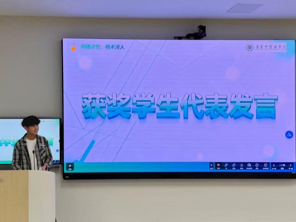 2023级中药学专业学生周坤作为两届获奖选手代表发言。他结合自身备赛经验指出,有效备赛需系统掌握竞赛核心知识,并拓展课外内容,构建完整知识体系。在学习方法上,他建议同学们多看、多练、多思考,通过钻研例题与真题,提升解题能力与思维水平。他还鼓励大家踊跃参与,在竞技中突破自我,收获成长。