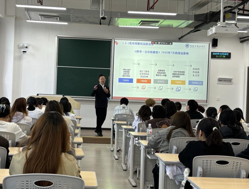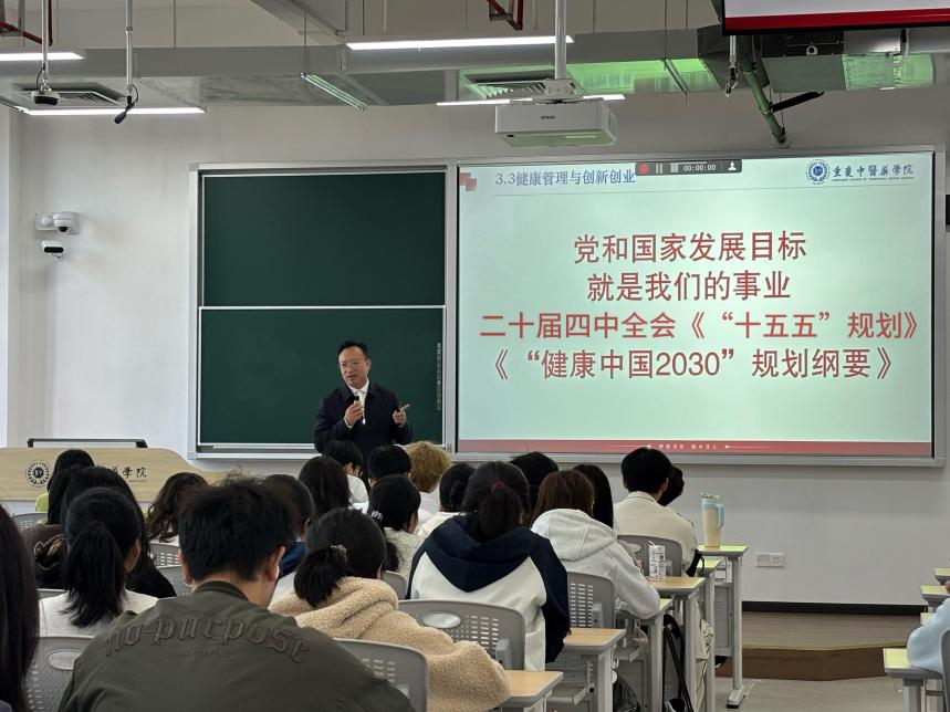 课程后半段,朱校长引入巴斯德象限创新理论和药酒案例,解析健康服务管理专业与创新创业的内在联系。针对专业发展方向,他指出党和国家发展目标就是我们的事业,鼓励同学们以政策为导向,密切关注《“健康中国2030”规划纲要》和“十五五”规划建议等重要文件,深入了解我国医药卫生体制存在的突出矛盾以及“十五五”时期医药卫生发展的总体思路、目标要求和政策举措建议,将个人专业发展与国家需求紧密结合,找准创新创业的发力点。