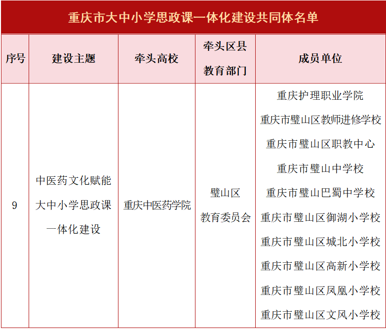 为落实立德树人根本任务的关键课程,推进大中小学思政课一体化建设,重庆市教育委员会于近日发布《重庆市教育委员会关于开展大中小学思政课一体化共同体建设工作的通知》,经前期自主申报、重庆市教委审核确认等程序,重庆中医药学院等20所高校入选共同体组建单位。