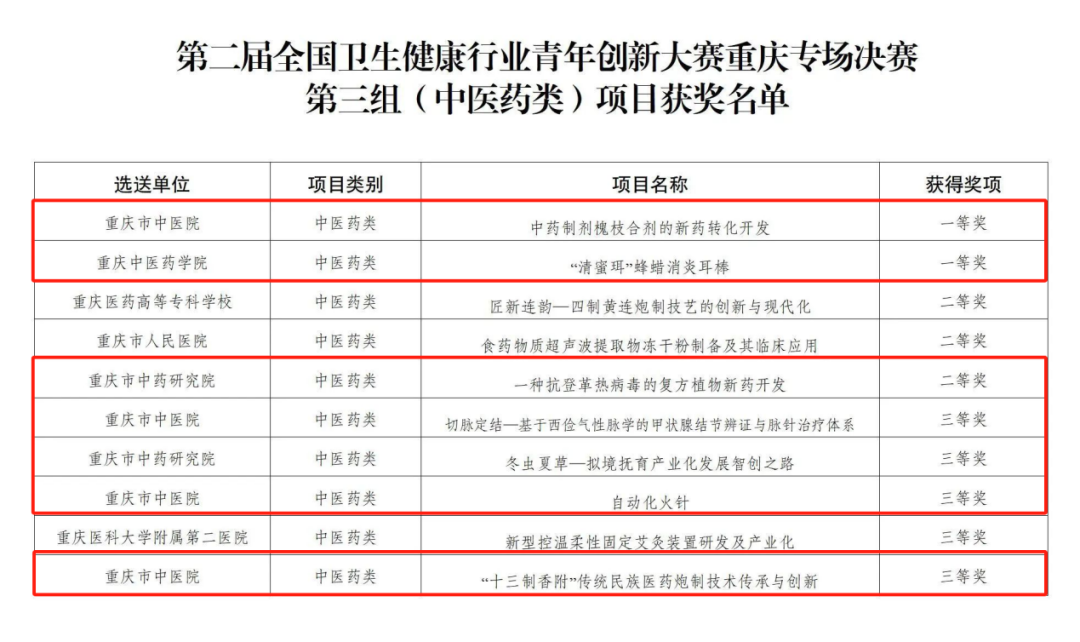 其中,重庆中医药学院附属第一医院(重庆市中医院)《中药制剂槐枝合剂的新药转化开发》、重庆中医药学院《“清蜜珥”蜂蜡消炎耳棒》荣获大赛“中医药类”一等奖,重庆市中药研究院《一种抗登革热病毒的复方植物新药开发》荣获二等奖,重庆中医药学院附属第一医院还获三等奖3项、重庆市中药研究院获三等奖1项。