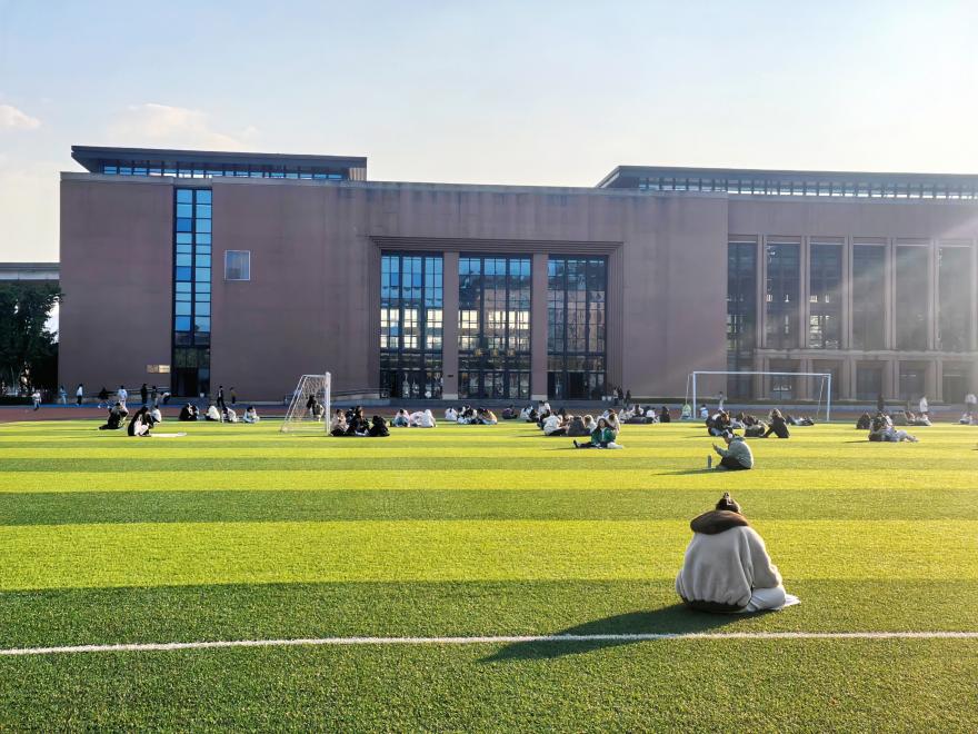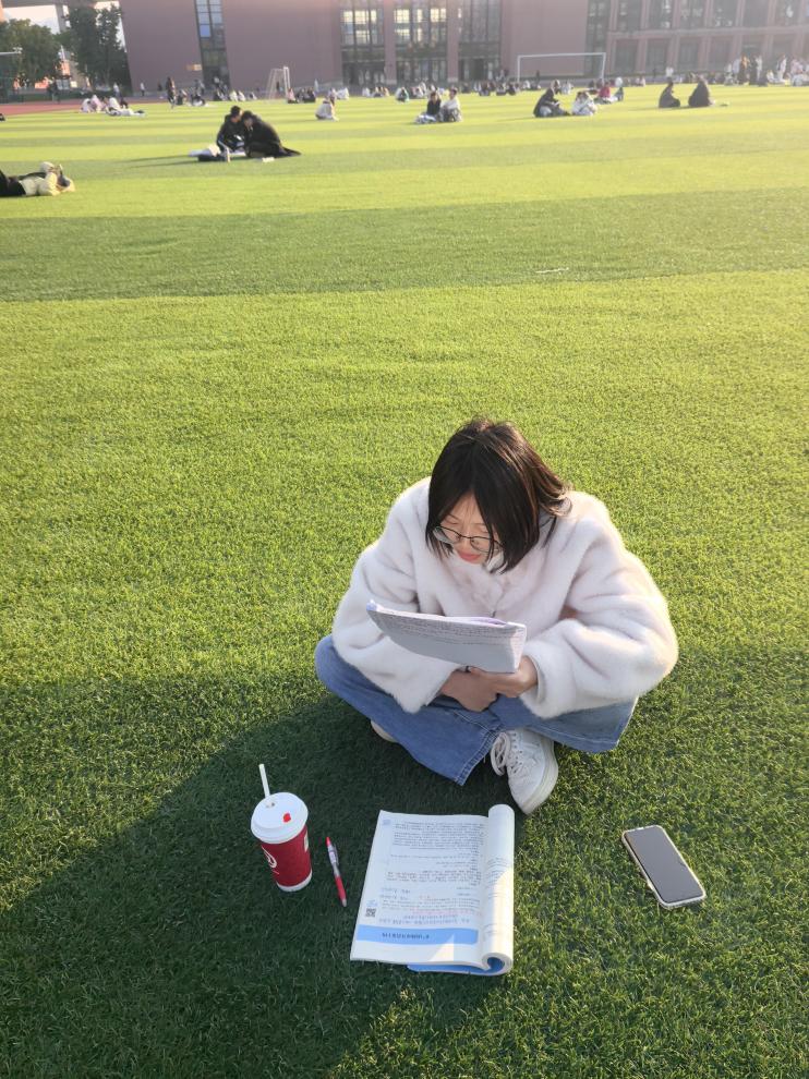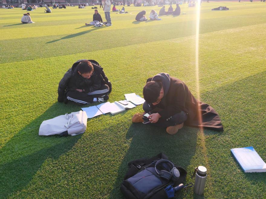 暖阳之下的操场,更是一派静谧的备考景象。绿茵场上、看台之上,随处可见静坐复习的身影。他们或背靠栏杆,或席地而坐,在开阔的天地间与经典对话。微风拂过,带走些许疲惫,也让诵读经方的声音更显清亮。
