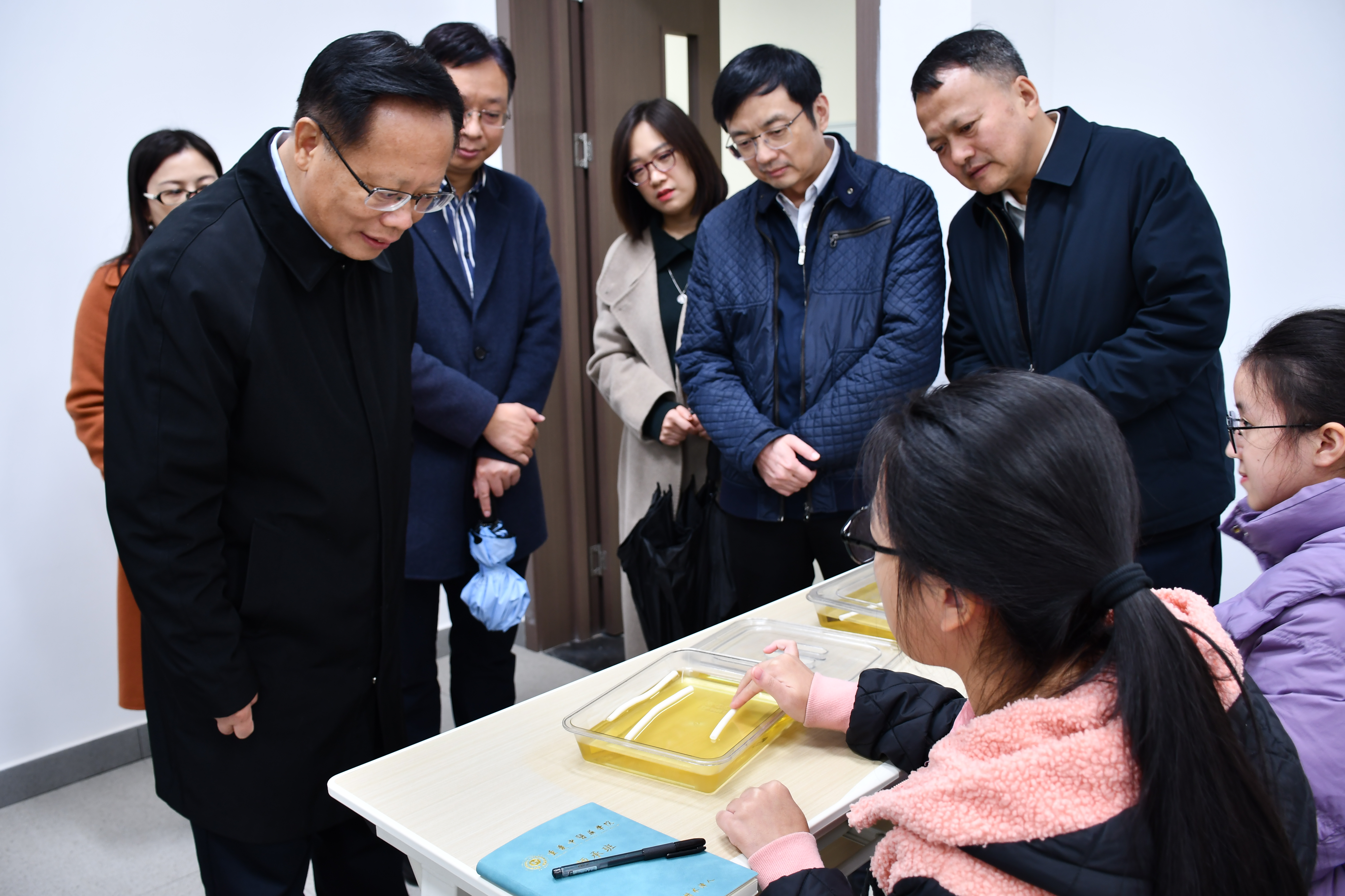 秦怀金一行参观调研了我院古中医研究院、基础医学院、中医学院,在留小忠教授师承实验班教学课堂上,他与学生们亲切交流,详细询问学生们的课程安排和校园生活等情况,并嘱咐同学们:学习、身体都要抓牢,要保证体育运动的时间;学中医大有可为,希望同学们坚持对中医学习的热爱,做好中医药传承接班人。