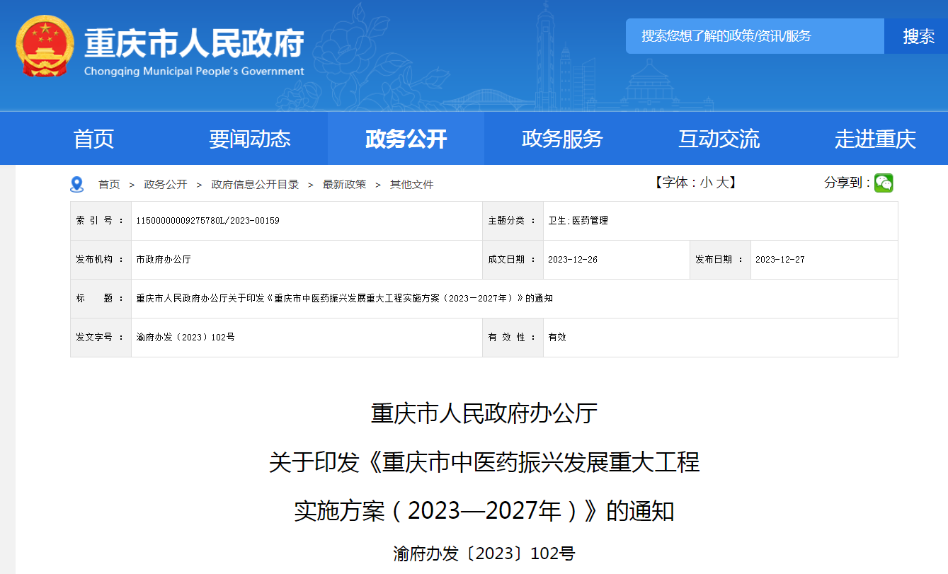 《重庆市中医药振兴发展重大工程实施方案(2023—2027年)》已经市政府同意,现印发给你们,请认真贯彻执行。
