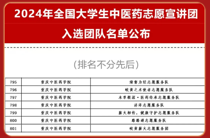 本次活动受到各高校志愿服务团队的广泛关注和积极参与,经过审核遴选,共有来自重庆中医药学院、北京大学、北京中医药大学等406所高校的1000支大学生志愿服务团队成功入选,我院“缘督为经志愿服务队”“岐黄之术使者志愿服务队”等7支志愿服务队在列。