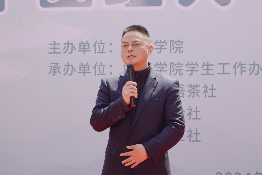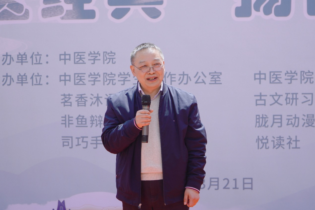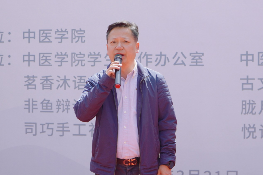 重庆中医药学院党委宣传部部长唐彤东在活动中为同学们送上寄语,他希望大家能够在这里玩得开心、学得有趣,希望同学们积极参与到各项社团活动中,找到自己的兴趣,也成为中医文化的继承者和传承者。