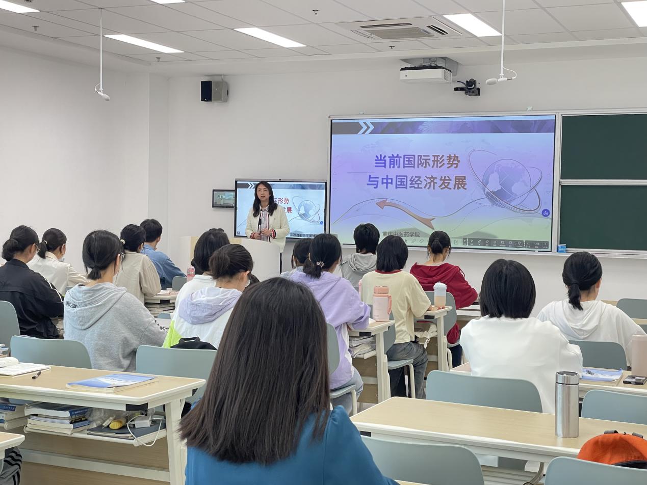 讲课中,唐丽灵全面分析了国际形势与经济现状,特别是当前中国经济面临的挑战与企稳回升的总体态势。她将中医药发展纳入国际国内经济发展大环境中进行系统分析,用“抗疫”的生动实践说明了社会主义国家始终坚持以人民为中心的制度优越性,引起了学生共鸣。