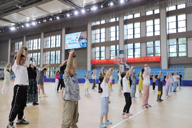 “马步要扎稳,膝盖与脚尖方向一致!”“握拳不能太紧,动作要缓慢、有力!”开步、上托、吸气、下落、呼气……伴随着舒缓的音乐,孩子们和家长一起学习了中医养生功法——八段锦的基础动作,通过手脚的协调配合,感受身心舒展,增强体魄。