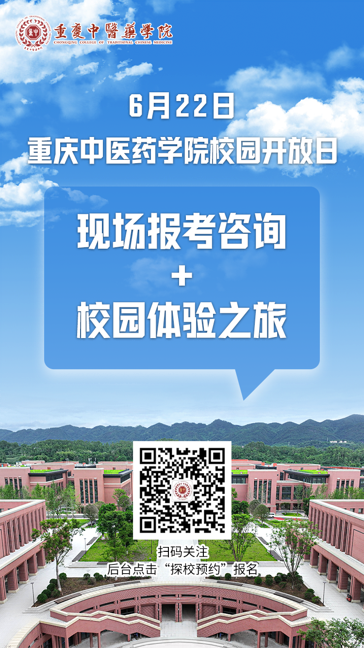 请考生和家长关注“重庆中医药学院微发布”微信公众号,进入公众号后台,点击“探校预约”填写“2024年6月22日重庆中医药学院校园开放日报名表”预约报名。