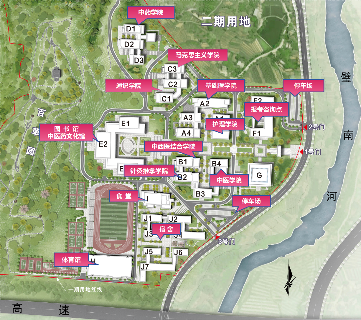 导航搜索重庆中医药学院,校园开放日当天车辆从2号门或3号门进入,可将车辆停放在2号、3号门停车场以及校区附近路侧停车位。