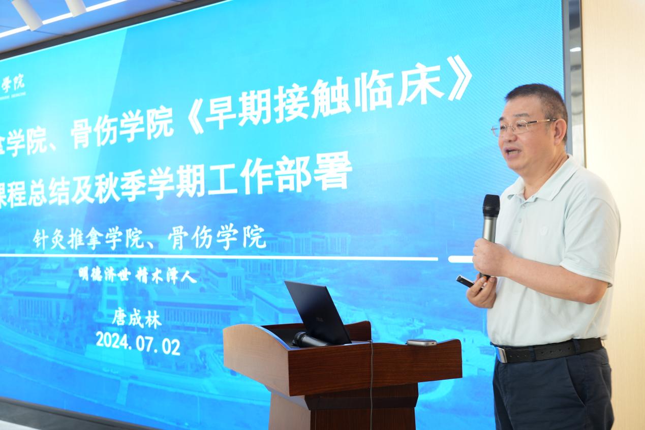 学院针灸推拿、骨伤学院院长唐成林强调了“早临床”教学中理论与实践相结合的重要性,并针对教学中如何培养学生的中医思维和临床能力提出了意见建议。