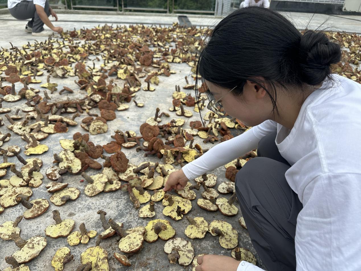 18日上午,实践队来到天同仙草苑,实地了解当地中药材种植情况。实践队成员在天同仙草苑技术人员的带领下,边走边看边听讲解,他们了解到大顺的生态环境优越,适宜灵芝、黄精等中草药的生长。在大顺,采用林下还原野生方式开展了大面积的灵芝、黄精等名特中草药种植,种植面积上万亩。现场,实践队成员还与当地村民一起拔草、翻晒灵芝,切实在体验中深刻感受到中医药学子的责任与担当。