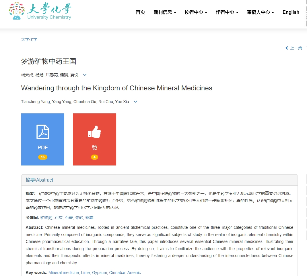 近日,我院中药学院2023级中药学专业学生杨天成以第一作者身份在《大学化学》期刊发表了科普论文《梦游矿物中药王国》,这也是我院中药学院学生第一次在正式学术平台发表论文。该科普论文生动阐述了中药矿物药和无机化学之间的密切联系,体现无机化学课程思政育人成效。