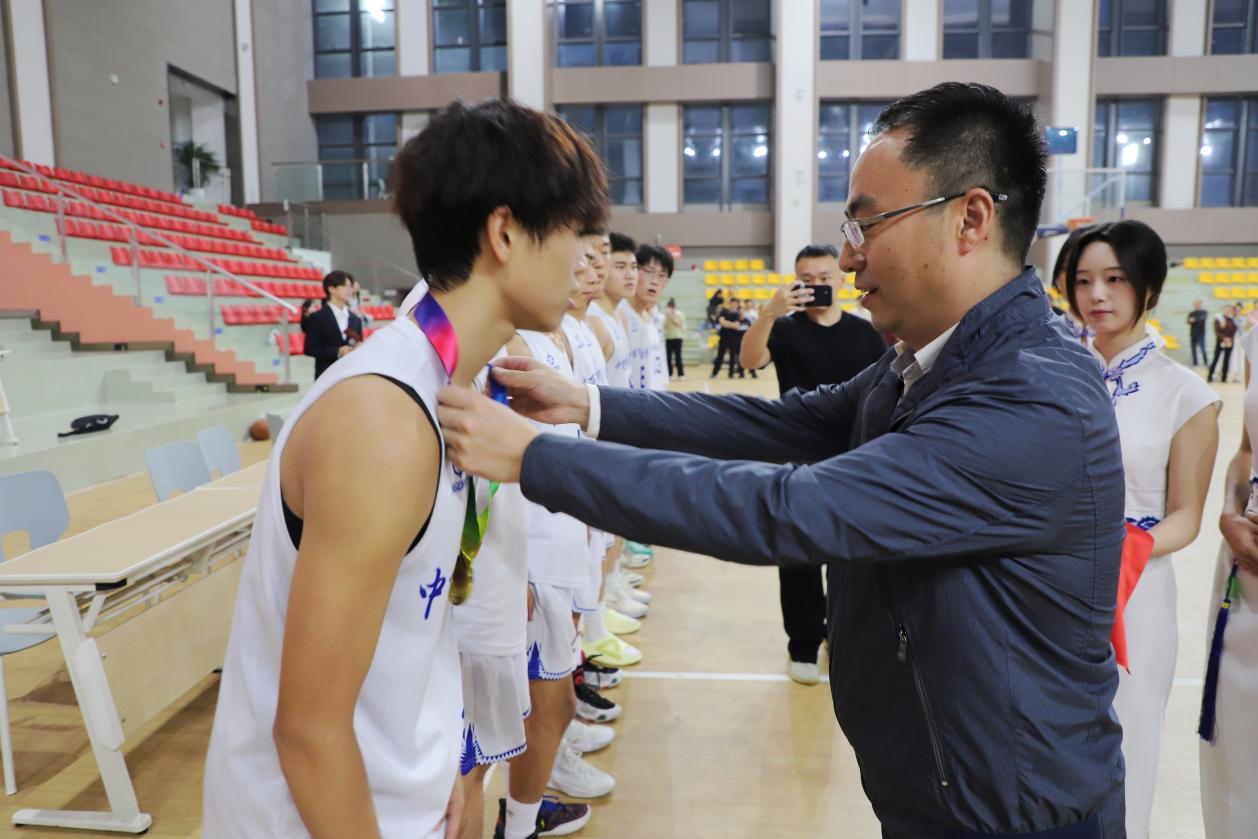 ▲党委学工部部长任源钢为男子组季军——中医学院男子篮球队颁奖