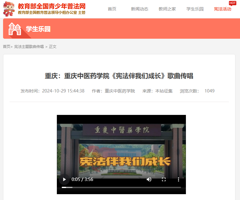 我院学生参与创作的《宪法伴我们成长》歌曲传唱MV作品被教育部全国青少年普法网收录展播
