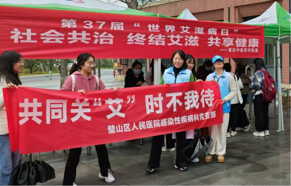 为提高学生对艾滋病的认识,加强艾滋病防治宣传,构建健康、和谐、安全的校园环境,近日,我院联合璧山区疾控中心、璧山区妇幼保健院、璧山区人民医院开展了以“社会共治,终结艾滋,共享健康”为主题的第37个“世界艾滋病日”防治宣传主题活动。