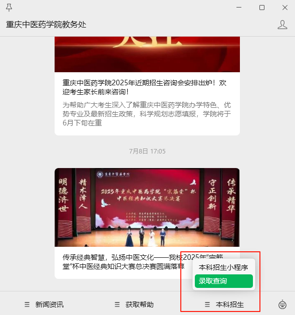 也可通过重庆中医药学院教务处微信公众号右下角“本科招生-录取”查询,在手机上查询录取结果。