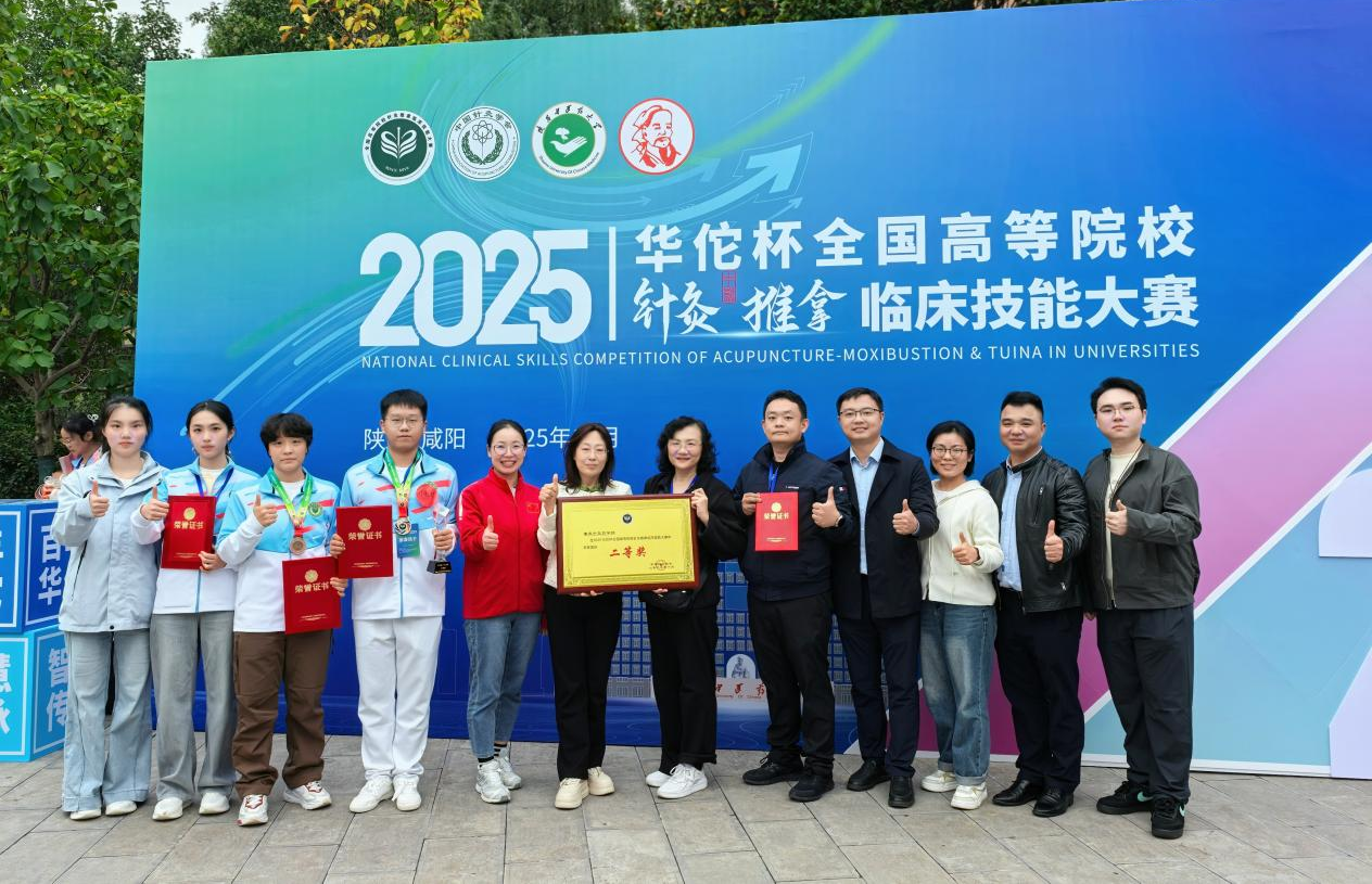近日,2025“华佗杯”全国高等院校针灸推拿临床技能大赛在陕西中医药大学圆满落幕。重庆中医药学院代表队首次参与该项全国性赛事,便凭借扎实的专业功底、娴熟的临床技能与稳定的临场发挥,从全国众多参赛高校中脱颖而出,最终荣获团体二等奖,并斩获1项个人全能(学生组)二等奖、1项腧穴定位单项奖(学生组)二等奖、1项刺法单项奖(学生组)三等奖,为学院赢得了荣誉,充分展现了学院在针灸推拿专业教育领域卓越的教学成效。
