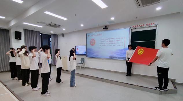 面对鲜红团旗,全体新团员高举右拳庄严宣誓,誓言铿锵有力,承诺将共产主义理想信念融入行动,以实际践行青春担当。