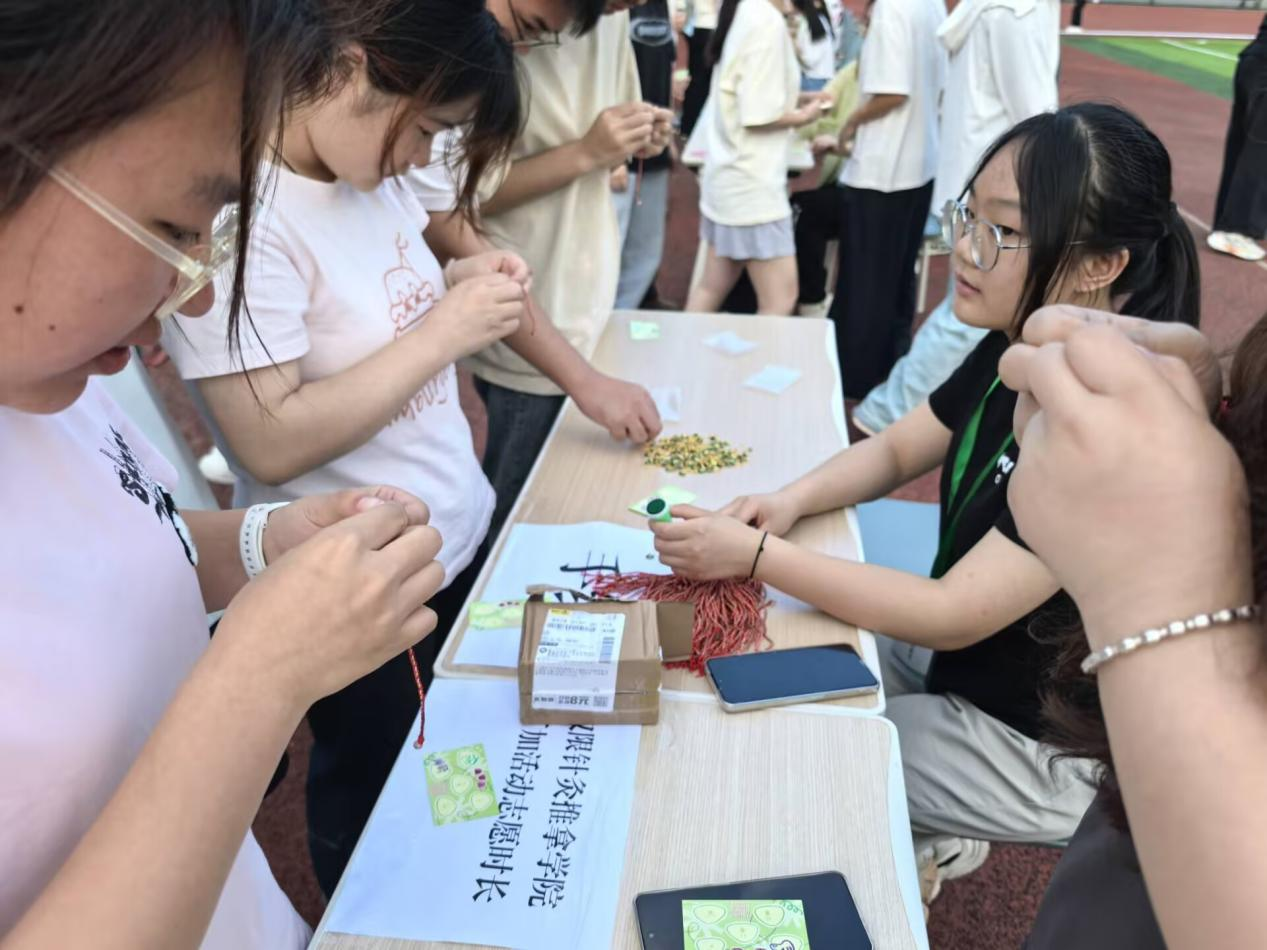 五色丝线穿梭指尖,编织出端午安康的美好祈愿。辅导员辛培宇生动的向同学们讲述五彩绳的文化密码:青、白、红、黑、黄对应五行,象征天地万物和谐共生。同学们在非遗技艺的实践中,既体验传统手工艺的精妙,更读懂古人“顺时而动、应季而为”的生存智慧。