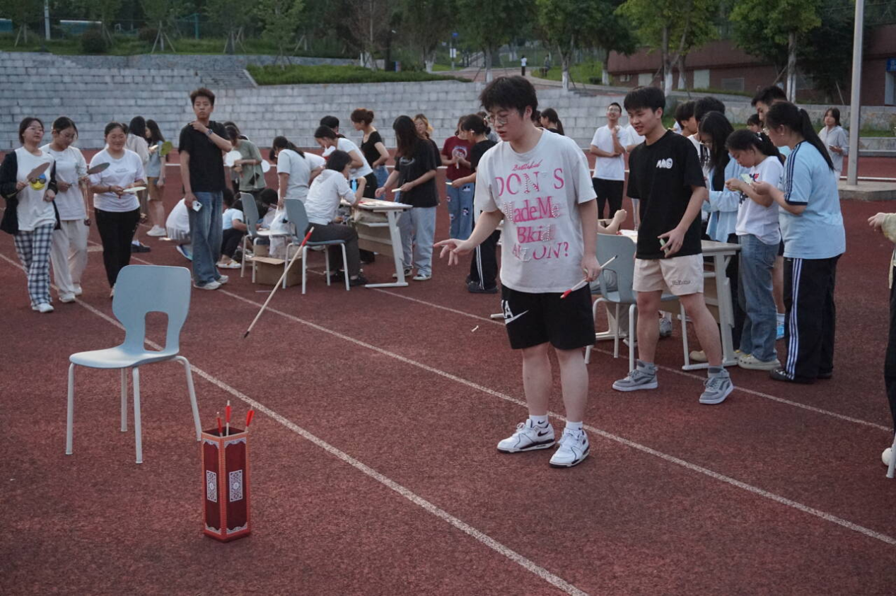 投壶自古便是“射礼”的雅化,承载着“修身立德”的东方智慧。活动现场,同学们凝神屏息、引矢投掷,随着箭矢入壶的清脆声响,“揖让周旋”的君子之风跃然眼前。这一传统竞技将“礼乐教化”融入现代校园,让参与者在方寸之间感悟中华礼仪“中正平和”的文化精髓。