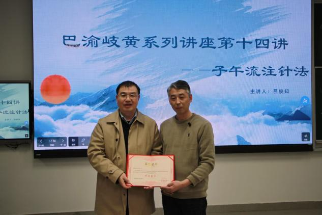 讲座临近尾声,针灸推拿学院骨伤学院唐成林院长为吕俊知先生颁发特邀嘉宾”证书先生临别赠言:“子午流注,顺天地之序,合生命之律,守之则身心和畅,传之则文脉绵长。”