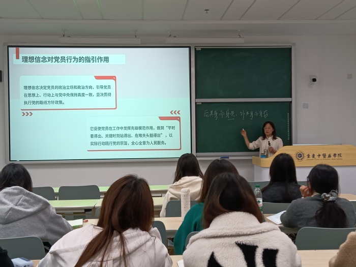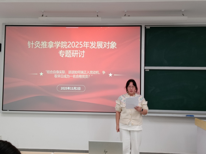 前期的培训让学员们在思想层面明晰了对党的认知、坚定了入党信念,2025年11月9日下午16时,针灸推拿学院党总支副书记李学智书记的党课则立足学院专业特色与国家战略需求,为此次线下培训落下关键一笔。李学智书记以“坚定理想信念,做中医药发展与健康中国建设的合格党员先锋”为题讲授专题党课,她围绕理想信念是党员的精神基石、合格党员的标准与要求、中医药发展的使命与机遇、党员如何助力中医药发展等核心内容,结合中医药事业发展实际与健康中国战略部署,要求学员们坚定政治信仰、严守纪律底线、提升专业素养,在中医药传承创新、健康中国建设中发挥先锋模范作用。李书记的党课兼具思想性与指导性,为学员们指明了在专业领域践行初心使命的实践路径。