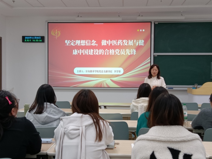前期的培训让学员们在思想层面明晰了对党的认知、坚定了入党信念,2025年11月9日下午16时,针灸推拿学院党总支副书记李学智书记的党课则立足学院专业特色与国家战略需求,为此次线下培训落下关键一笔。李学智书记以“坚定理想信念,做中医药发展与健康中国建设的合格党员先锋”为题讲授专题党课,她围绕理想信念是党员的精神基石、合格党员的标准与要求、中医药发展的使命与机遇、党员如何助力中医药发展等核心内容,结合中医药事业发展实际与健康中国战略部署,要求学员们坚定政治信仰、严守纪律底线、提升专业素养,在中医药传承创新、健康中国建设中发挥先锋模范作用。李书记的党课兼具思想性与指导性,为学员们指明了在专业领域践行初心使命的实践路径。