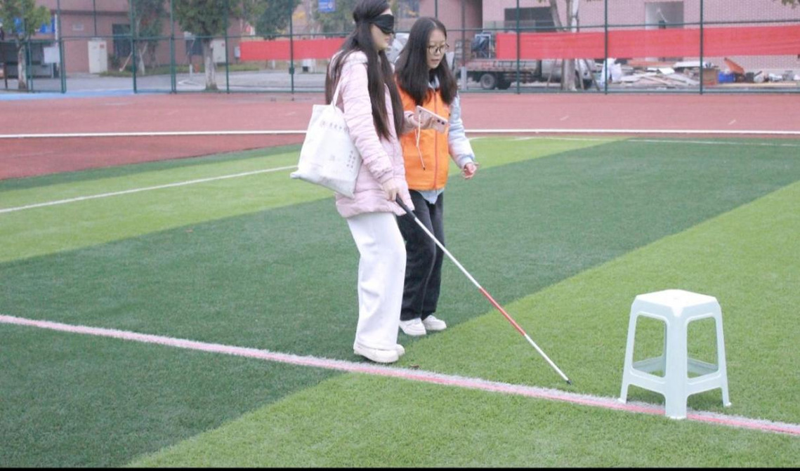 “蒙眼贴心”区采用“双人协作”模式,一人蒙眼穿越预设障碍路线,另一人担任“爱心向导”指引路线。为筑牢安全防线,安全志愿者实时排查隐患。在黑暗与信任的双重考验中,参与师生体悟到视障群体日常出行的艰辛,进一步破除认知偏见,深化了对视障群体的尊重。