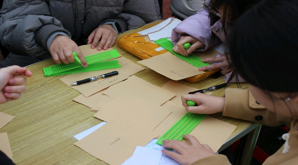 “盲文递温”区内,盲文指导组志愿者通过专业讲解、盲文卡片示范,引导师生借助盲文板与盲文笔,书写 “平安”“温暖”“志愿” 等简短词句。书写完成后,志愿者协助在纪念卡标注相应文字,让每一张承载盲文印记的纪念卡,成为定格志愿温情、见证爱心成长的专属藏品。