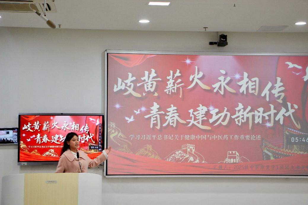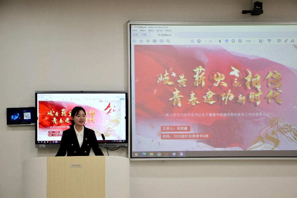 大赛现场,氛围热烈而庄重。参赛选手紧扣赛事主题,立足中医药专业特色,将岐黄文化的千年薪火与新时代青年的使命担当深度融合,展现出扎实的专业素养与坚定的理想信念。