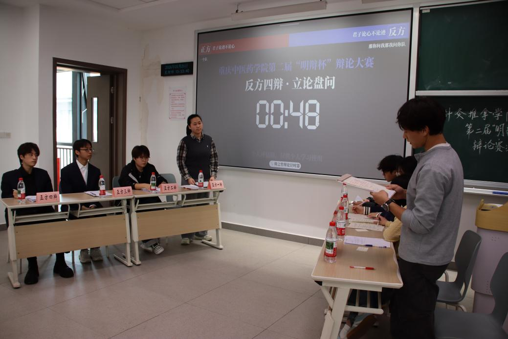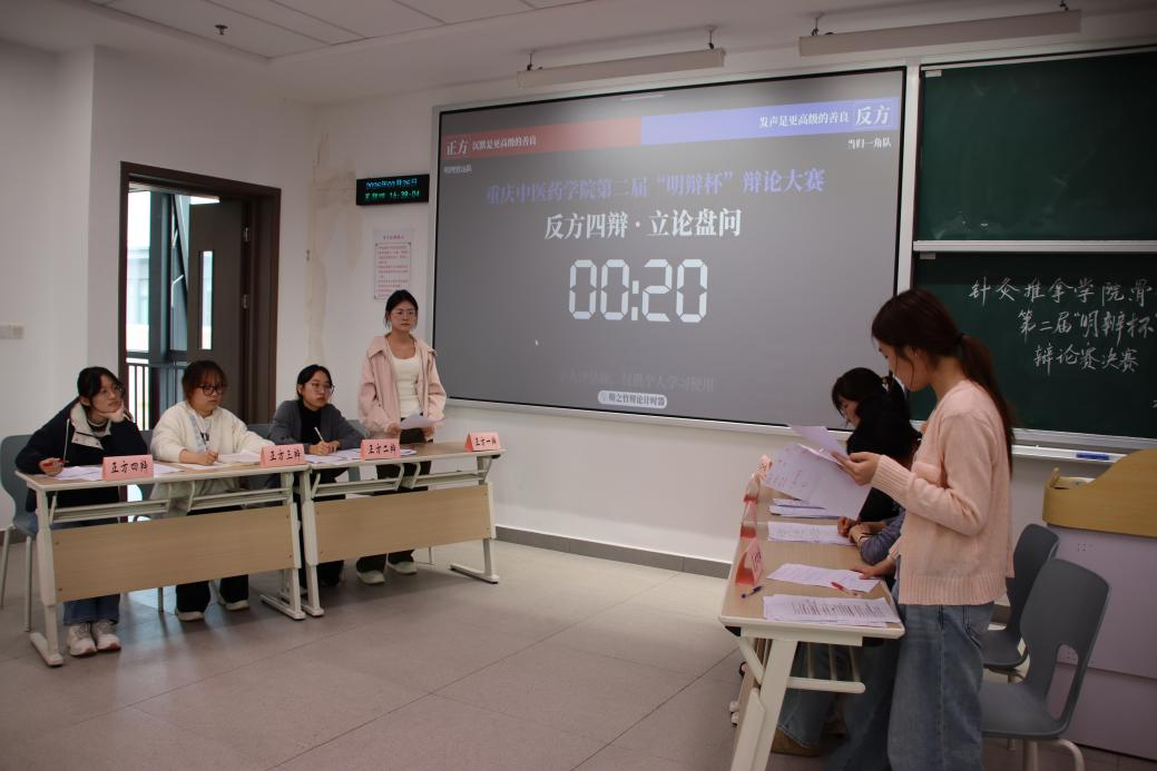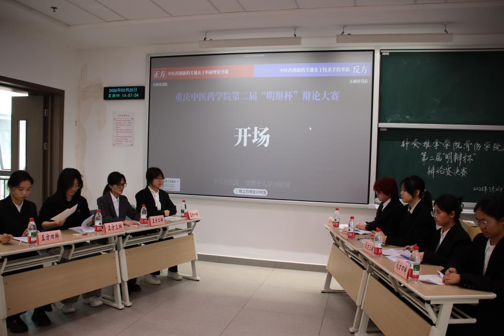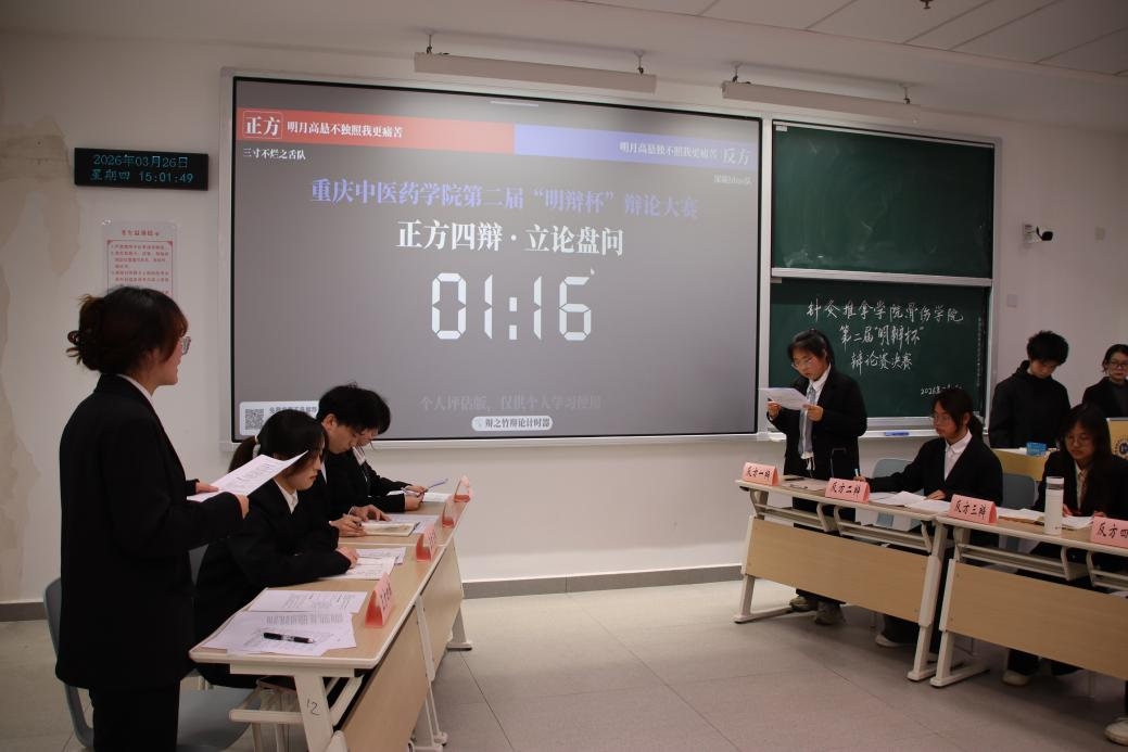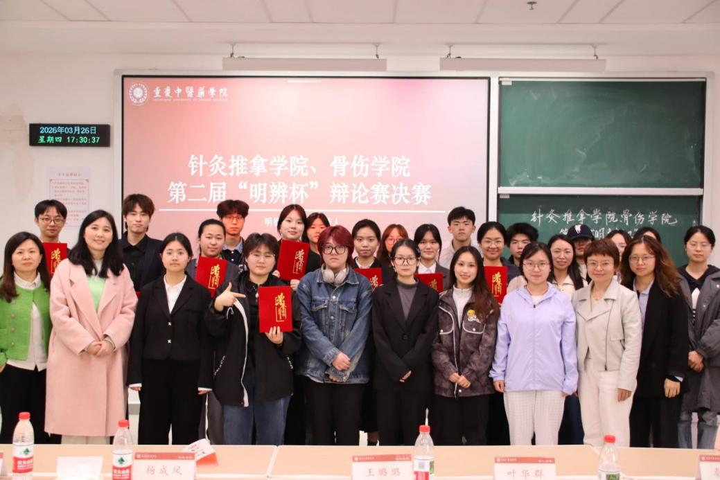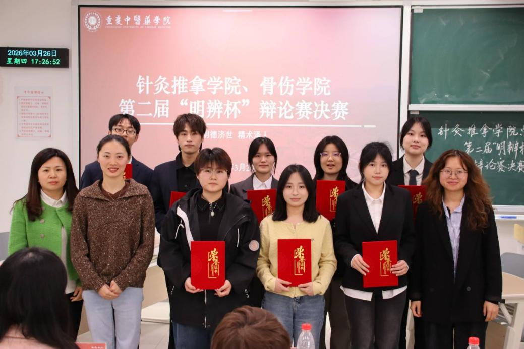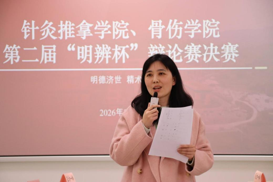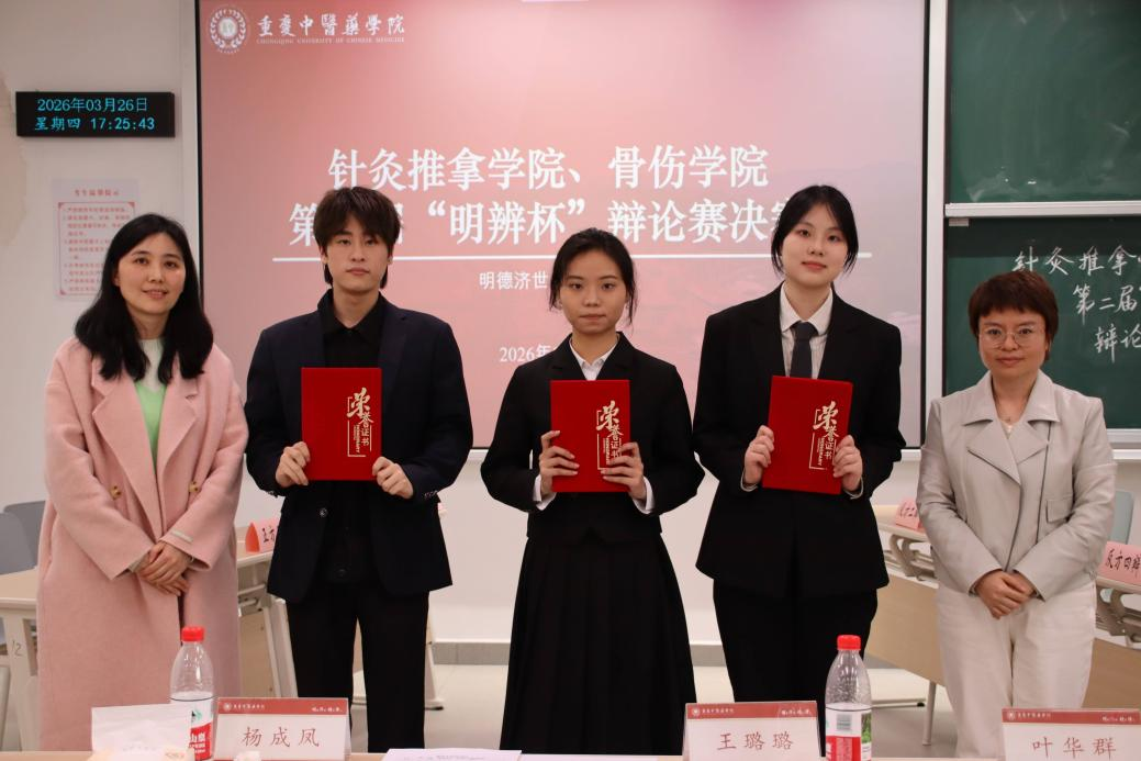 唇枪舌剑,尽显风采,思辨明理,正逢佳时。2026年3月26日,由针灸推拿学院、骨伤学院学生工作办公室主办,团总支、学生会承办的第二届“明辨杯”辩论赛决赛在B2 - 404教室圆满举行!此次辩论赛特别邀请了马克思主义学院王璐璐、马克思主义学院杨成凤、通识学院叶华群、马克思主义学院邹左、重庆市江津区中医院秦硕泽五位老师担任现场评委。