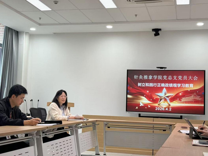 2026年4月2日,针灸推拿学院党总支组织召开全体党员大会,专题开展树立和践行正确政绩观集中学习教育,深入领会核心要义、凝聚思想共识、压实履职责任,推动正确政绩观深度融入中医药教育教学与事业发展全过程。