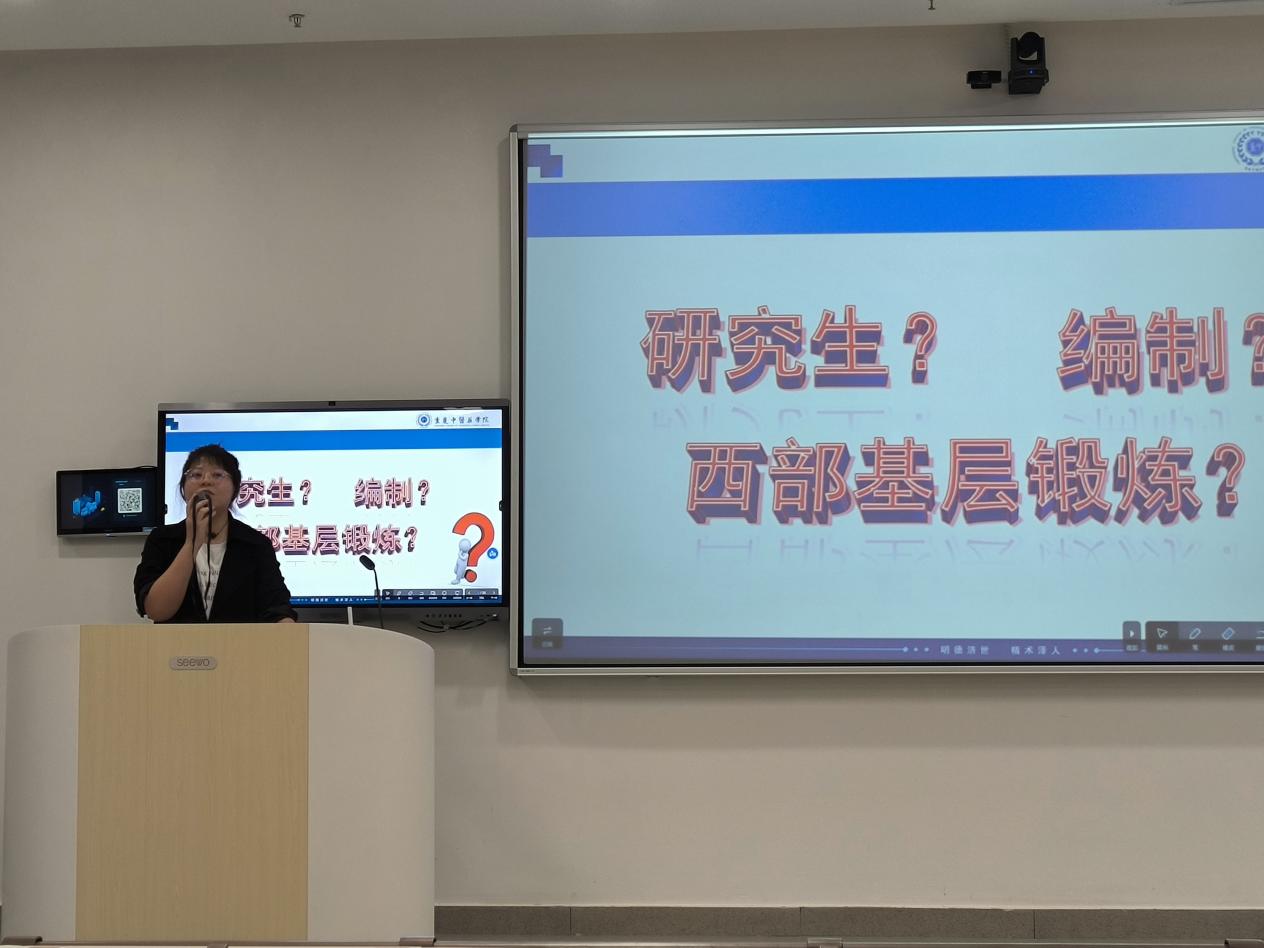 会议伊始,辅导员张成贤就抛出几个未来的发展方向,诱发同学们对自己的职业规划进行思考。引用了重医学长学姐的成功案例为我们指引前进的方向,正如去西部计划的学姐周粤所说:"虽然哪里都能实现人生价值,但是基层更需要我。"随后,张老师带领着学生干部们审视了时代局势,了解了就业压力,以此明确了职业规划的重要性。最后,辅导员向大家介绍了西部计划、三支一扶、乡村医生等多个未来职业选择,为前行中的同学们明确了航向。