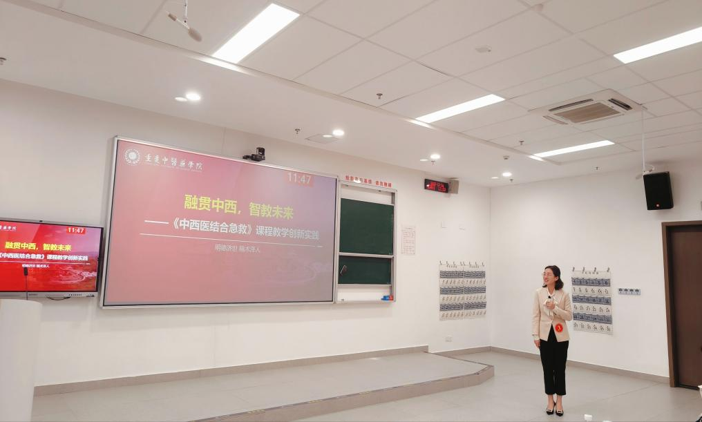 本次大赛汇聚全校各院系骨干教师同台竞技,是对学校教师教学创新能力与课程改革水平的全面检验。比赛中,严莲老师以“融贯中西,智教未来”为展示主题,聚焦《中西医结合急救》核心课程展开创新实践阐述。在教学设计中,她紧扣“衷中参西,至真至善”的院训精神,将职业素养与急救伦理融入教学各环节,赢得了评委专家的一致好评。