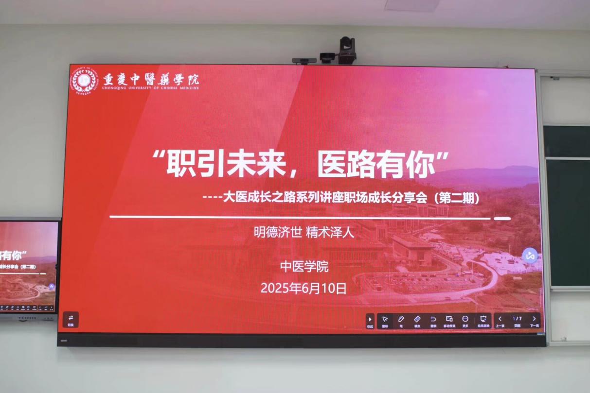 1.2025年6月10日,我院在E1-104成功举办第二期大医成长之路系列讲座之职场成长分享会,特邀黔江区水市镇卫生院书记、院长刘远望老师、江北区复盛社区卫生服务中心副主任黄梦老师、奉节县人民医院中医科主任李敬瑜老师担任主讲嘉宾。本次讲座汇聚2023级、2024级定向医学生及中医学专业学子,嘉宾们通过政策解读、经验分享与职业导航,助力大家在医学路上明确发展方向、坚定职业信念。