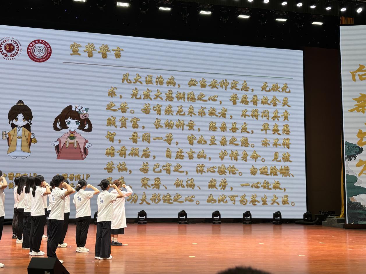 最振奋人心的便是医学生宣誓环节。中医学院教师钟晓靓博士与25级新生欧阳俊凯等15名同学并肩走上台前,“请全体新生举起右拳!” 随着指令,新生们挺直脊背,右拳高举,“凡大医治病,必当安神定志,无欲无求,先发大慈恻隐之心……” 誓言声穿透报告厅,回荡在校园,既是新生对医学使命的郑重承诺,更彰显中医传承后继有人的蓬勃力量。
