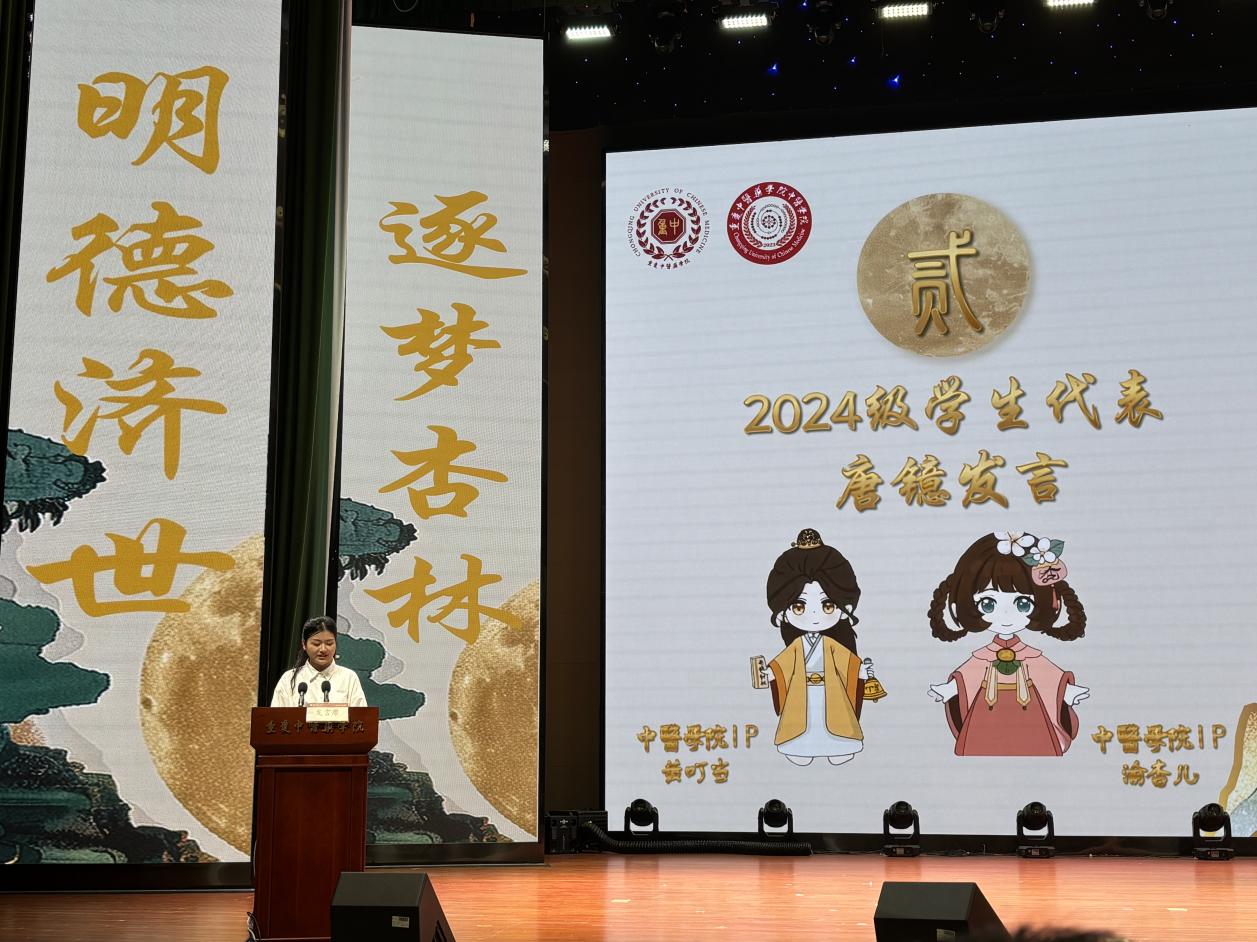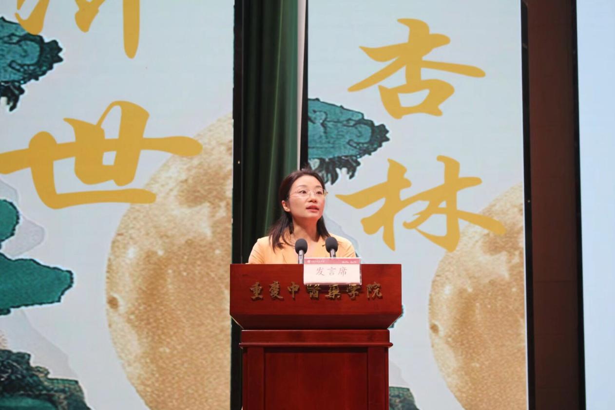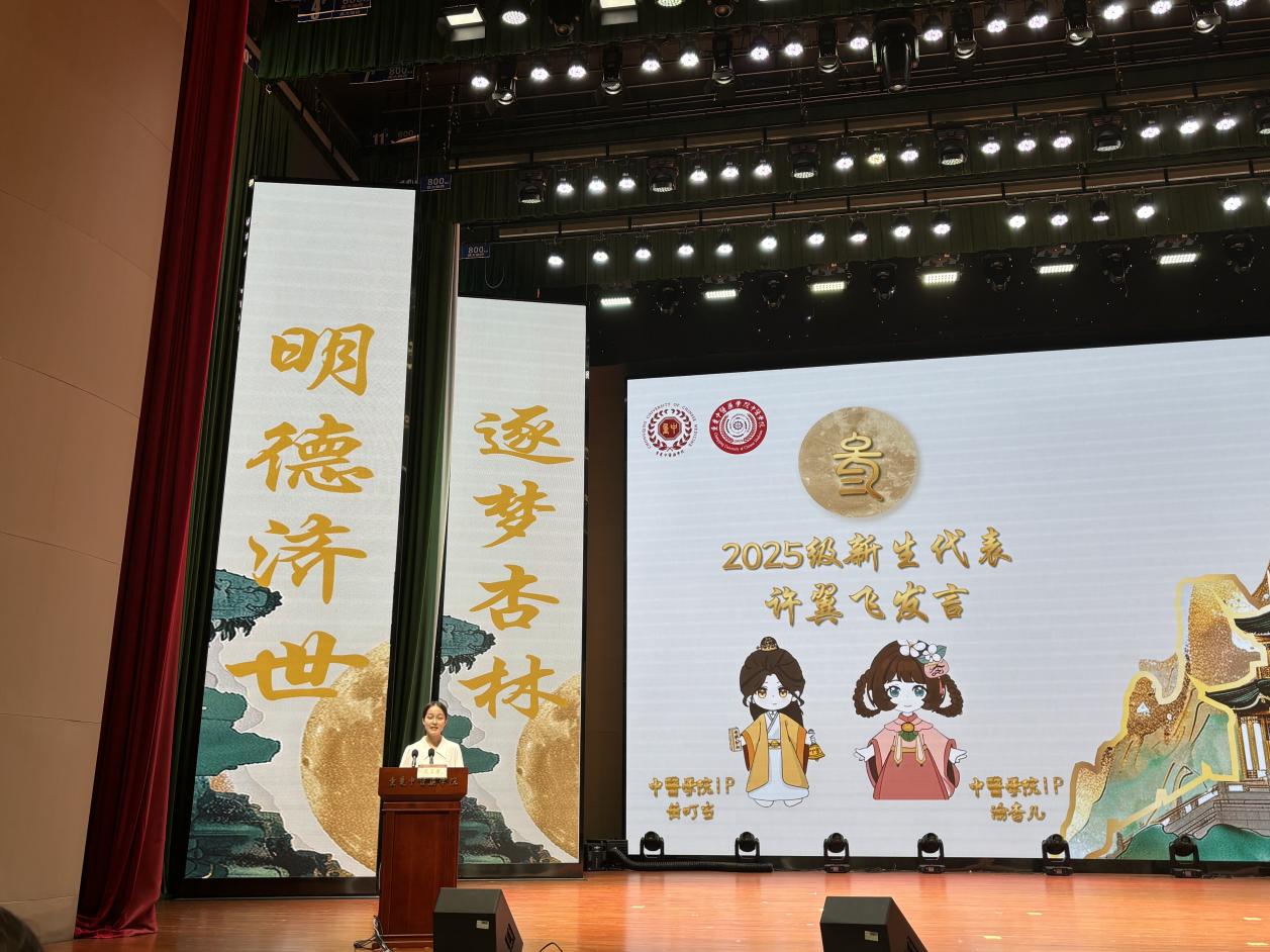随后,24级学生代表唐镱上台,结合一年学习经历分享中医课程学习方法与实践心得:“中医学习要‘读经典、做临床’,希望大家多泡图书馆、多跟老师问诊,日积月累夯实基础。”25级新生代表许翼飞则诉说对中医专业的热爱:“小时候家人用中医药照顾我,让我早早向往这门学科。如今来到重庆中医药学院,特别期待跟着老师深入学习,未来用中医知识守护身边人健康。” 新旧学子心声交流,让现场氛围愈发温馨。