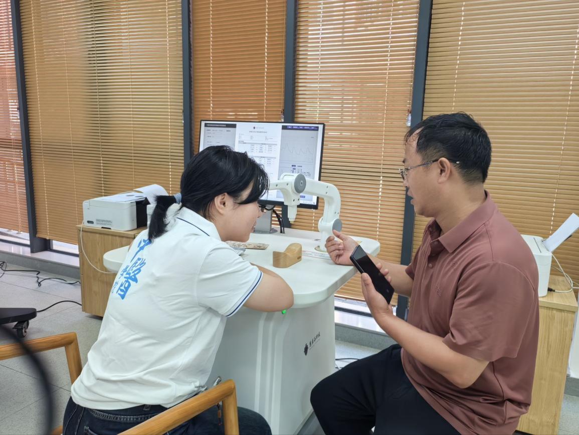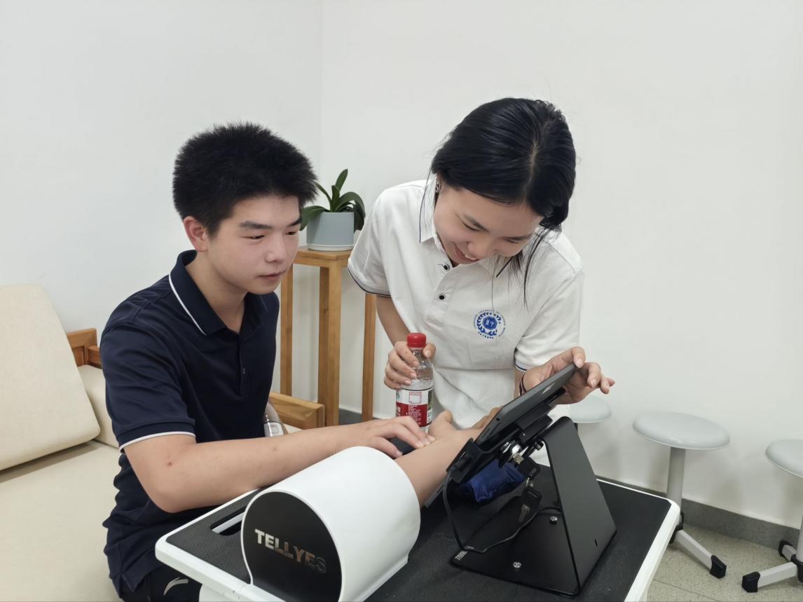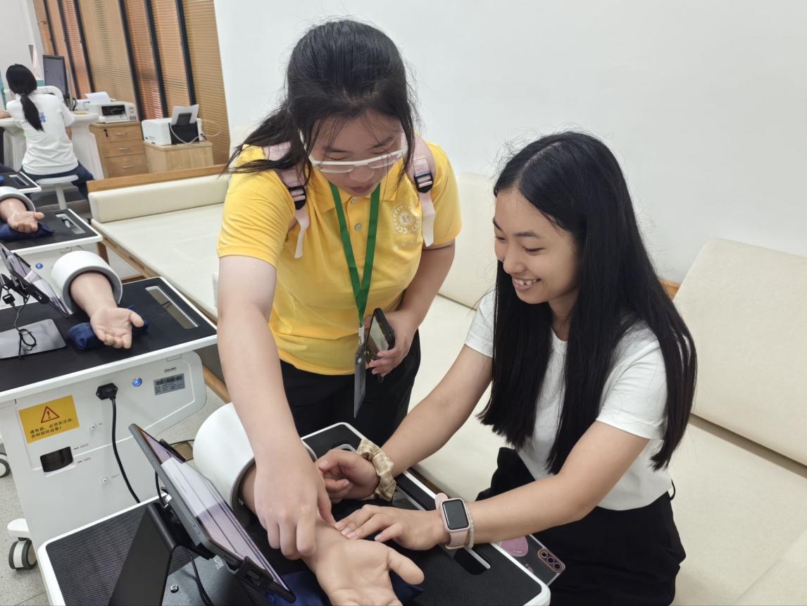 如果说校门迎接是 “暖心开场”,那么学院精心打造的三大中医体验区,更是让新生 “一秒爱上中医”。一楼大厅义诊区,杨艳梅教授、李巧颖副教授、尹涛副教授端坐其间,指尖轻搭新生与家长的脉搏,一边询问他们的日常作息与身体状况,一边结合生活场景给出建议。相邻的 111 现代诊疗室里,脉诊仪、面诊仪、人体穴位仪整齐摆放,简单操作后,屏幕便会呈现体质分析报告与穴位分布图,原本抽象的中医理论变得直观易懂,尽显中医与时俱进的活力。