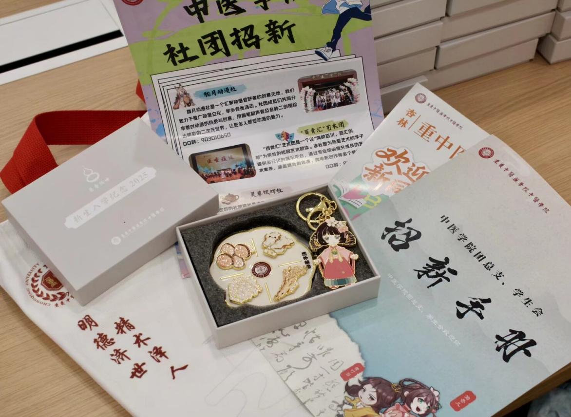 上午8时许,学院校门口已是一片 “志愿黄”。辅导员们身着印有 “中医学院” 的文化衫,志愿者佩戴证件,忙着引导新生完成报到。报到后,每位新生都会收到学院精心准备的中医特色伴手礼——定制“四君子汤”中医文创冰箱贴、学院动漫 IP 渝杏儿与黄叮当钥匙扣,还有便于随时翻阅的中医经典口袋书,每一份礼物都藏着中医巧思。