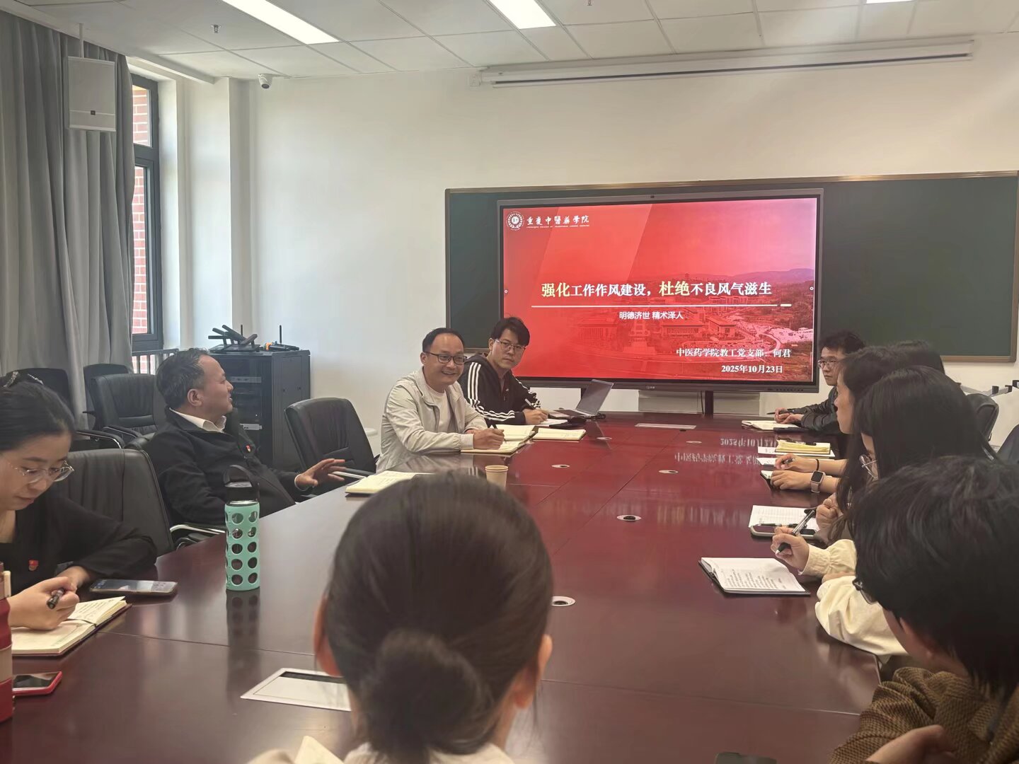 2025年10月23日上午,中医学院教工党支部在B4-312会议室举行10月主题党日活动暨党员大会。会议围绕加强工作作风、提升风险研判能力等核心议题展开,由支部书记何君主持,重庆中医药学院党委副书记、院长王勇德以普通党员身份参加。