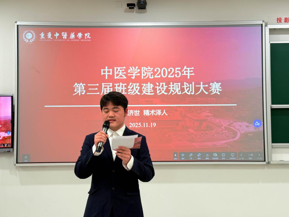 2025年11月19日,中医学院第三届班级规划大赛在E3-202教室顺利举行。本次大赛以“携手共绘班魂图,同舟破浪济沧海”为主题,特邀学工部朱照博老师、中医学院学生工作办公室副主任李霜老师、中医学院辅导员薛亦菲老师担任评委。来自学院2023-2025级三个年级的21个班级积极参与比赛,吸引了120余名师生到场观摩。经过激烈角逐,大赛最终评选出一等奖1名、二等奖2名、三等奖3名。本次活动有效增强了班级凝聚力与学生的集体荣誉感,为营造积极向上、团结协作的学院文化氛围发挥了积极作用。