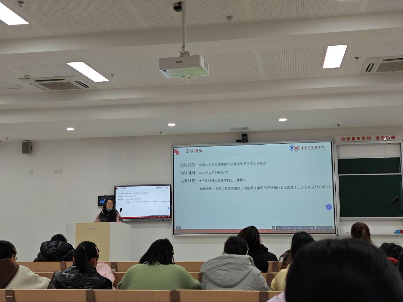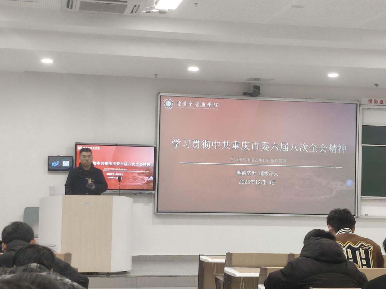 为深化对重庆发展大局的认知,凝聚将个人成长融入城市发展与国家建设的责任担当。2025年12月14日,中医学院召开专题学习班会,聚焦“学习贯彻中共重庆市委六届八次全会精神,奋力谱写中国式现代化重庆篇章”核心主题,系统学习全会关键内容,推动全会精神入脑入心。