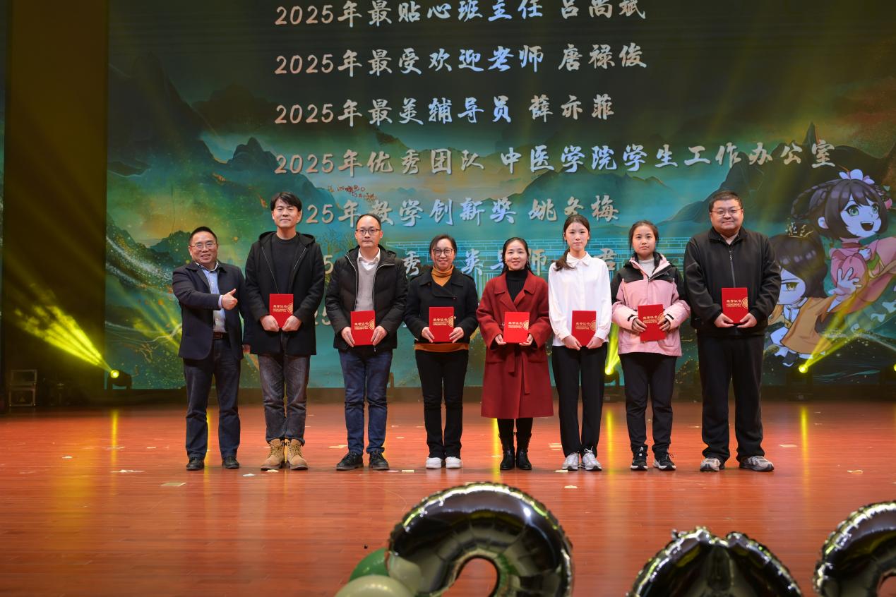 本次迎新晚会特邀唐樵致辞、唐丽灵宣布晚会开幕。晚会现场举行了颁奖仪式,表彰2025年度优秀教师及集体,涵盖最贴心班主任、最受欢迎老师、最美辅导员等个人荣誉,以及优秀团队、教学创新奖等集体与专项奖励;同时恰逢《杏林重中医》一周年,现场为优秀编务、优秀写作能手等获奖代表颁奖,彰显学院对育人工作与文化建设的重视。
